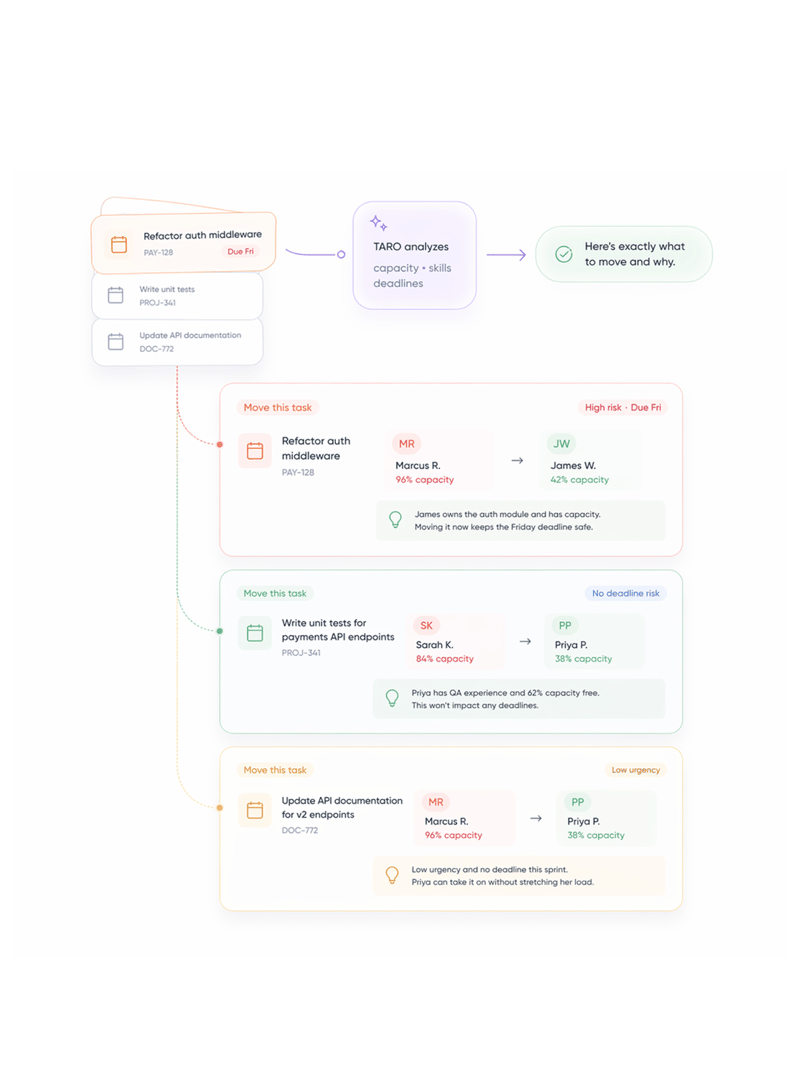 TARO doesn't tell you Marcus is overloaded consider rebalancing. It tells you exactly which task to move, who to move it to, and why that person is the right fit based on their available capacity, their skill match for the task, and the deadline risk of leaving it where it is.